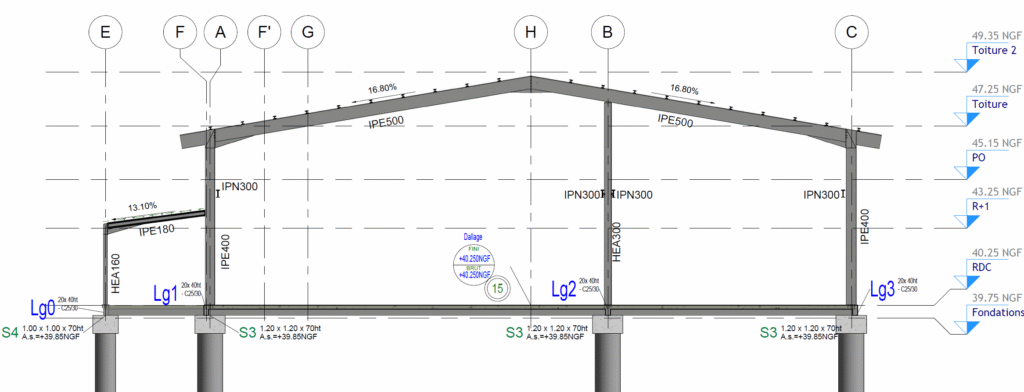 Dans le cadre de ce projet de création d’un bâtiment de bureaux et de stockage, nous avons été chargés de la réalisation complète des plans de coffrage, des plans de coupes ainsi que des détails d’assemblages métalliques, en étroite collaboration avec le bureau d’études et les différents intervenants du projet.
